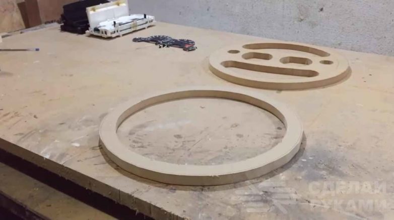 Корпус часов можно изготовить из фанеры или МДФ. Нужно отпилить два куска квадратной, сделать разметку и вырезать две основные детали.В одной детали полностью вырезаем середину, чтобы у нас получился круг, а во второй — вырезаем отверстия под табло приборной панели.