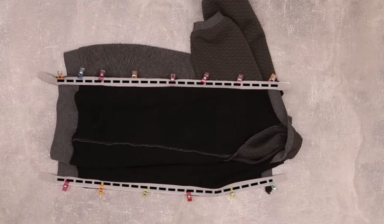 Толстовку выверните на изнаночную сторону, аккуратно расправьте и разметьте линию центра. Приклейте по намеченной линии клеевую нетканую ленту шириной около 4-5 см. Середина ленты должна соответствовать размеченной линии на толстовке. Разрежьте изделие по намеченной линии.