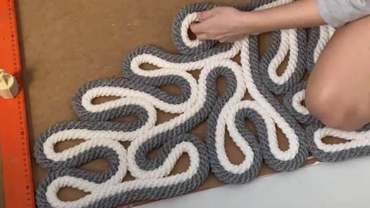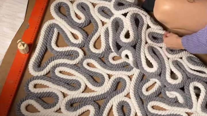 За основу можно взять готовый шнур или канат из магазина желаемого цвета (лучше брать 2 разных цвета), а можно самостоятельно связать крючком «Плотный жгут». На одно изделие понадобится порядка 30-40 м. Положите на рабочую поверхность картон прямоугольного размера, чтобы было удобнее работать. Теперь просто сворачивайте два шнура сразу, чтобы сделать завитушки в хаотичном порядке. Проклеивайте их между собой горячим клеем.