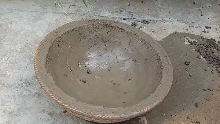 А внутри протрите стенки любым маслом. Разведите цемент водой, чтобы он стал жидким. Налейте в миску, распределите по стенкам.