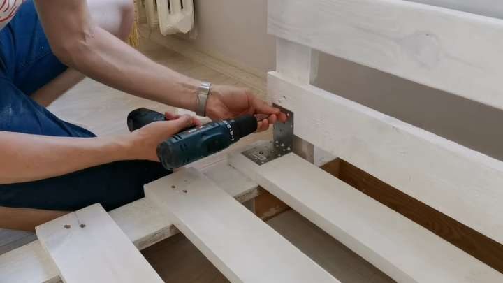 Соберите кровать из поддонов с помощью металлических уголков.