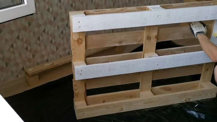 Соберите кровать, лишнюю длину поддонов подрежьте. Размеры поддонов — 100-120 см (понадобилось 7 шт.). Готовая кровать — 100*200 см.