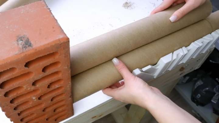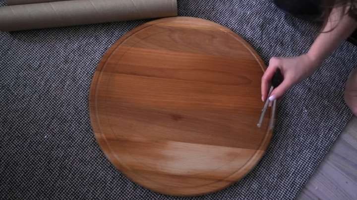 Подрежьте все картонные втулки от бумаги на одинаковую высоту 40 см. Доску или фанеру вырежьте ровным кругом. Наметьте внутренний круг 22 см, чтобы расположить втулки.