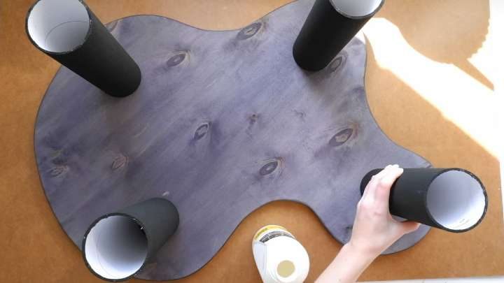 Втулки покрасьте акриловым колорантом, смешанным с небольшим количеством клея ПВА и соды. Приклейте на ПВА втулки к столешнице из фанеры.