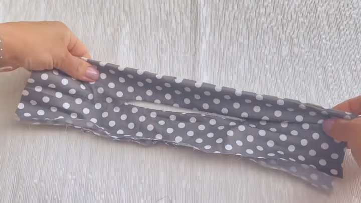 Выверните на лицевую сторону через отверстие по центру. Прошейте по всему прямоугольнику, отступая 0,5 см от края. Оставьте небольшое окошко не зашитым.