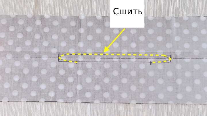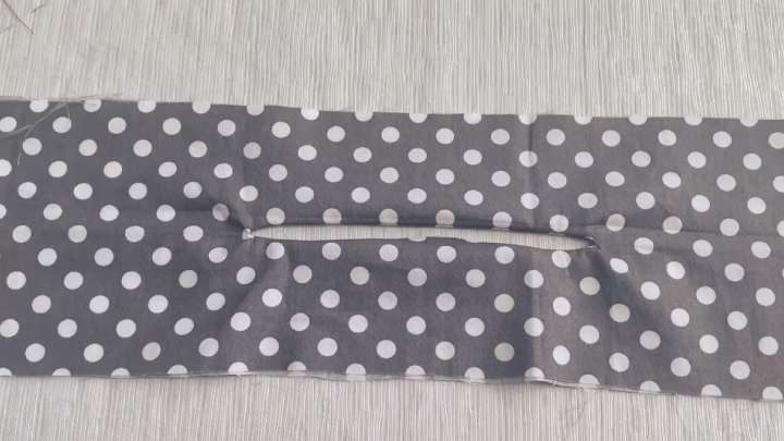 Разрежьте по центральной линии внутри прямоугольника. Возле закруглённых краёв сделайте насечки ножницами, чтобы ткань не топорщилась.