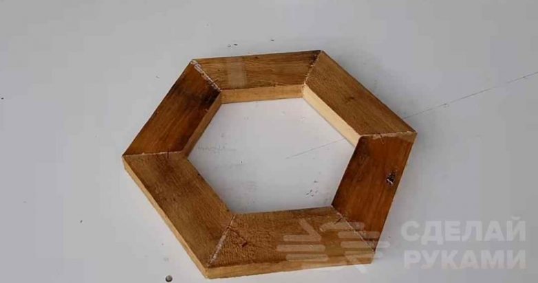 Далее из напиленных заготовок необходимо будет склеить шестиугольники. Попарно склеиваем подготовленные шестиугольники так, как показано на фото ниже.