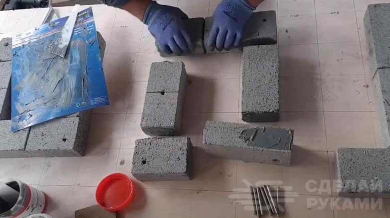 На следующем этапе замешиваем цементный раствор (можно взять плиточный клей) и соединяем кирпичи между собой.