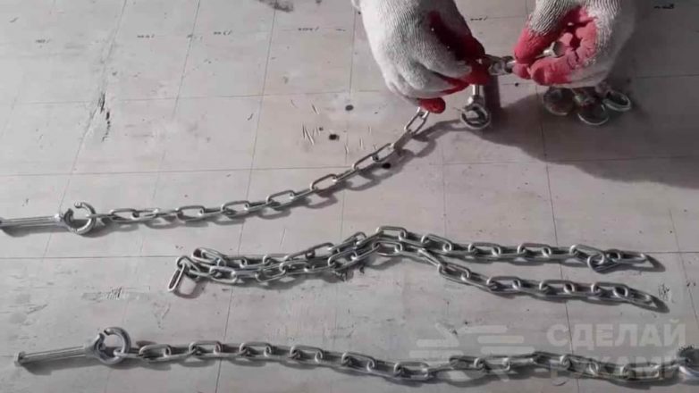 Далее отрезаем четыре куска металлической цепи одинаковой длины. Цепь лучше брать потолще. Также нам понадобятся рым-болты с гайками. Отрезаем от болтов небольшую часть, чтобы можно было надеть цепи.