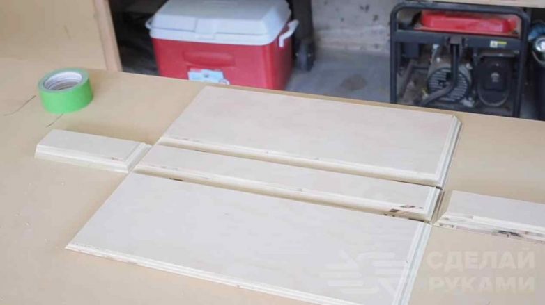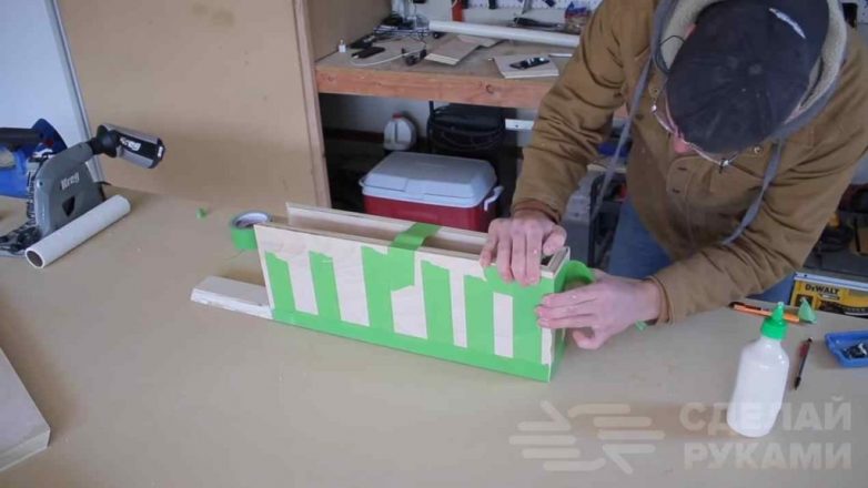 На следующем можно приступать к склейке подготовленных деталей из фанеры. Фиксируем их с помощью изоленты или скотча.