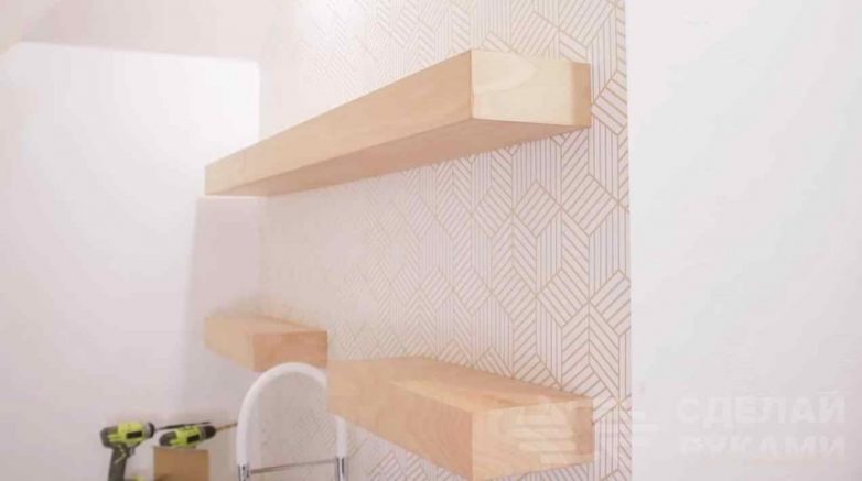 Крепим каркасы в нужном месте, потом надеваем на них готовые полки (предварительно их нужно обработать минеральным маслом или просто покрыть лаком — так они прослужат дольше). Да и выглядеть будут привлекательнее.