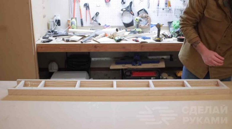 Далее из напиленных заготовок из фанеры мастер делает каркасы, на которые будут надеваться полки. Сами каркасы крепятся к стене.