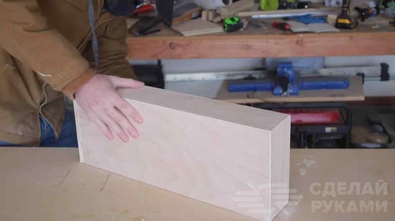 Далее отрезаем от фанеры заготовки необходимых размеров. Кромки заготовок, которые будут примыкать друг к другу, нужно обрезать под углом 45 градусов с помощью ручной циркулярки.