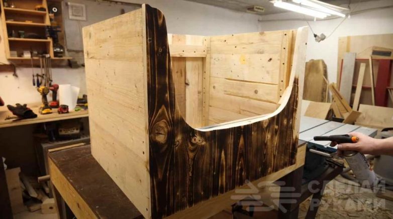 Из досок склеиваем еще один щит. Отпиливаем его по контуру ванны, после чего крепим к основному каркасу.Обжигаем древесину газовым (туристическим) баллончиком с горелкой. Зачищаем поверхность металлической щеткой, а потом покрываем лаком или минеральным маслом.