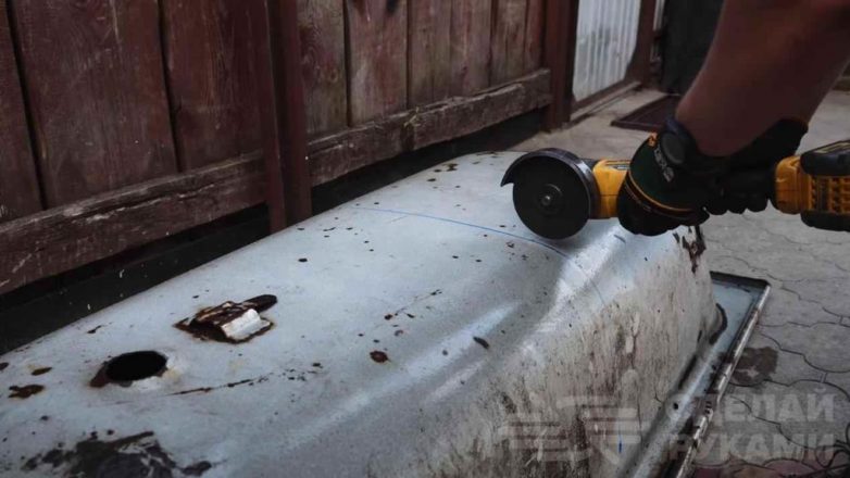 Далее автор делает разметку и с помощью болгарки отрезает часть металлической ванны.