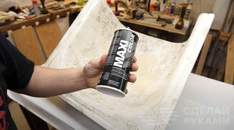 Потом подготовленную часть нужно покрасить. Мастер использует аэрозольную краску в баллончике. Перед покраской покрываем поверхность металла грунтом.