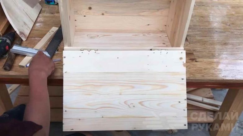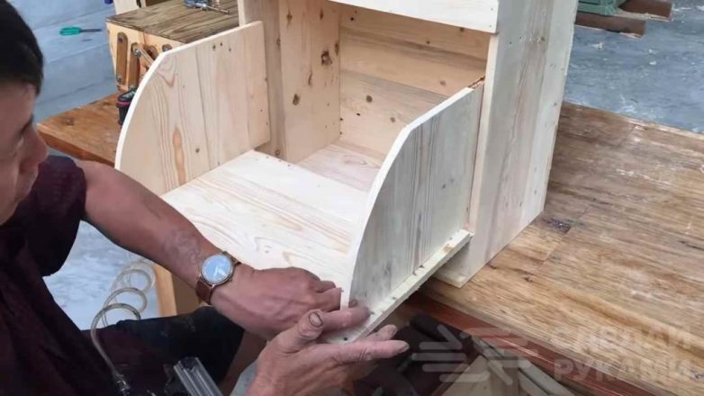 Спереди прибиваем планки, к которым крепятся на петли дверцы. Крепим к ним боковые стенки с закругленным верхним краем.