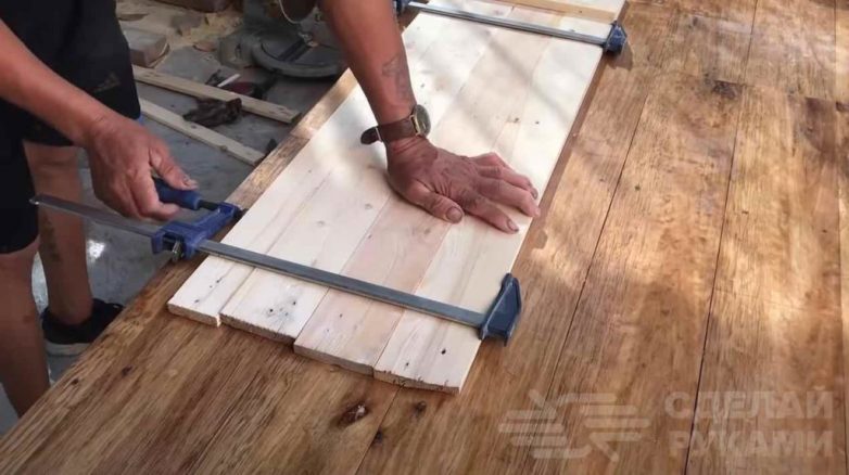 Первым делом необходимо будет склеить из подготовленных досок два щита (их размеры будут зависеть от размеров самого шкафа).