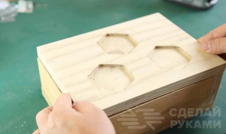 Первым делом из листа ДВП вырезаем три шестиугольника. Это будут ключи для открытия шкатулки. В крышке шкатулки, используя получившийся шаблон, автор вырезает «посадочные места» под ключи.