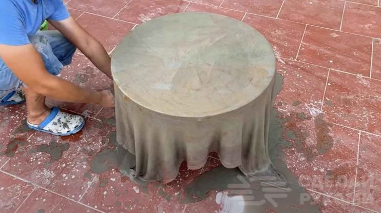 Стол из велосипедного колеса, куска ткани и цемента