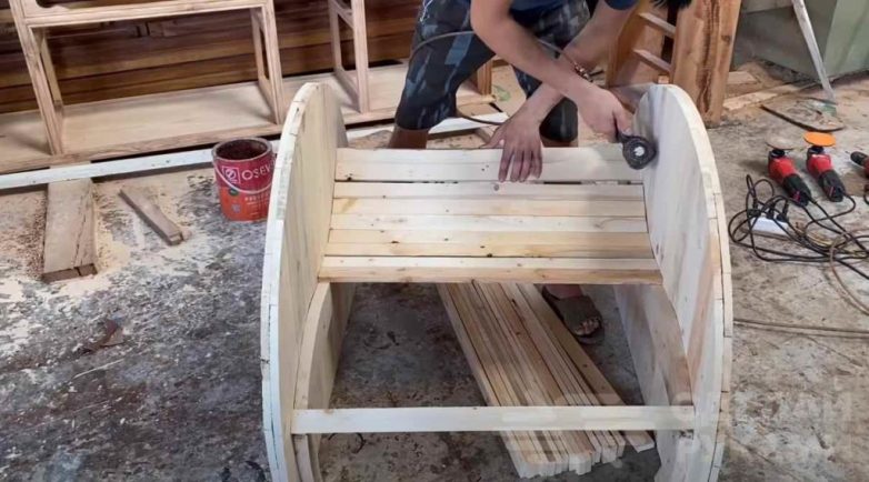 Далее занимаемся изготовлением спинки. Крепим две деревянные планки и затем обшиваем их рейками, как и сиденье.