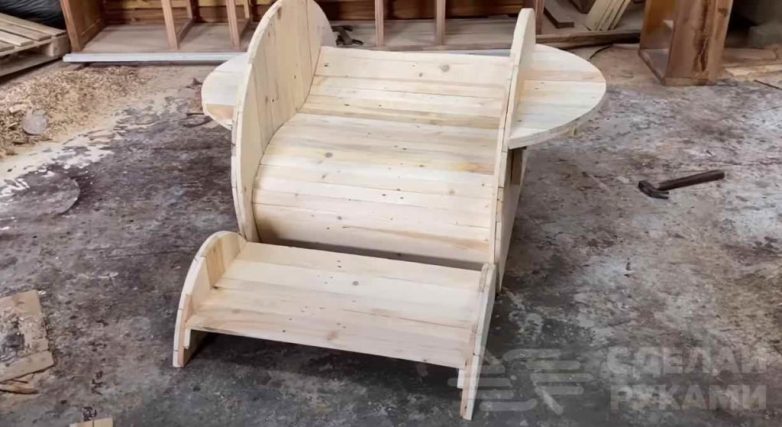 По бокам кресла автор крепит две полукруглые полочки, на которые можно будет поставить стакан с бутылкой или положить какие-либо вещи (например, смартфон).