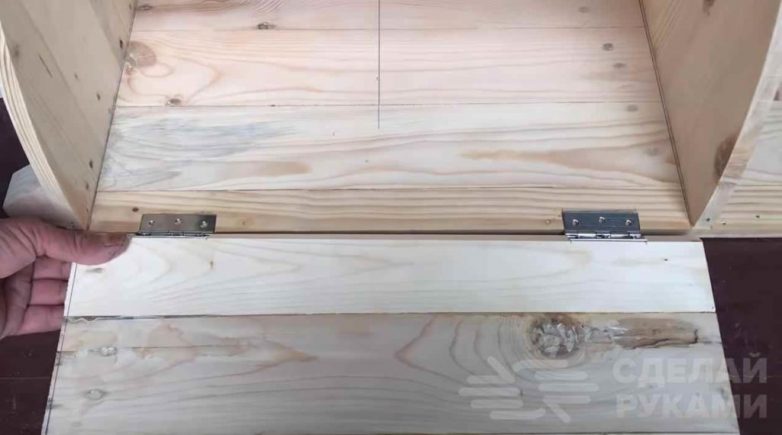 В нижней части собранной конструкции автор прикручивает разделительную планку. После этого оставшихся щитов изготавливаем две дверцы и крепим их на мебельные петли.