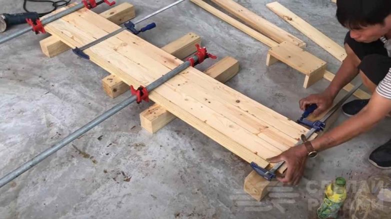 Далее из подготовленных досок склеиваем щиты. Готовые щиты шлифуем болгаркой. Длинные щиты будут использоваться в качестве стенок, из коротких — делаем полки и дверцы.