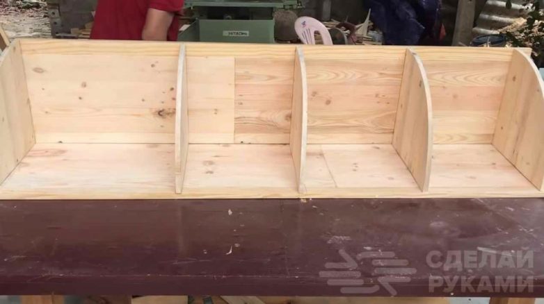 На следующем этапе вырезаем на ленточной пиле угловые полки. Крепим их к одной из стенок. Затем крепим вторую стенку.