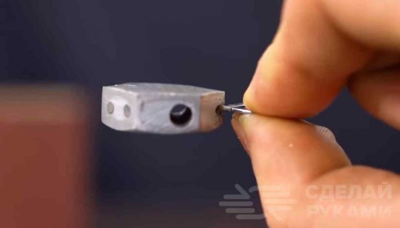 На последнем этапе останется только просверлить в шляпке еще одно отверстие, но уже сквозное. В него автор вставляет полоску наждачной бумаги, скрученную в трубочку.