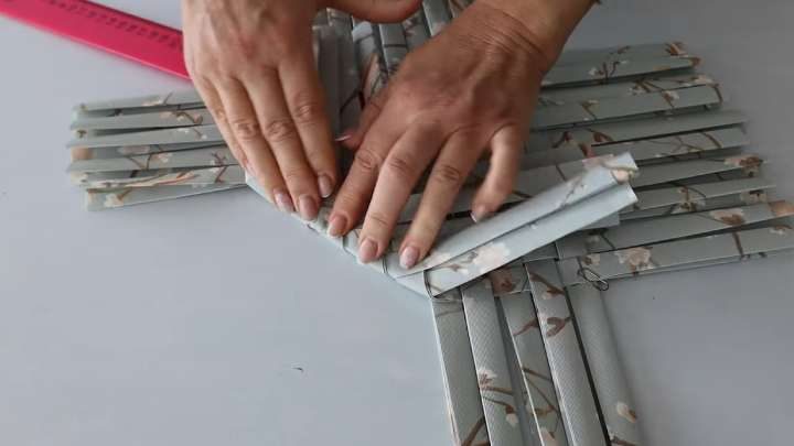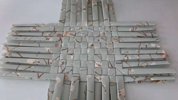 Возьмите 10 полосок и переплетите их с другими 10 полосками. Постарайтесь плести так, чтобы со всех четырёх сторон осталась одинаковая длина полос. Края переплетённых полос зафиксируйте горячим клеем.