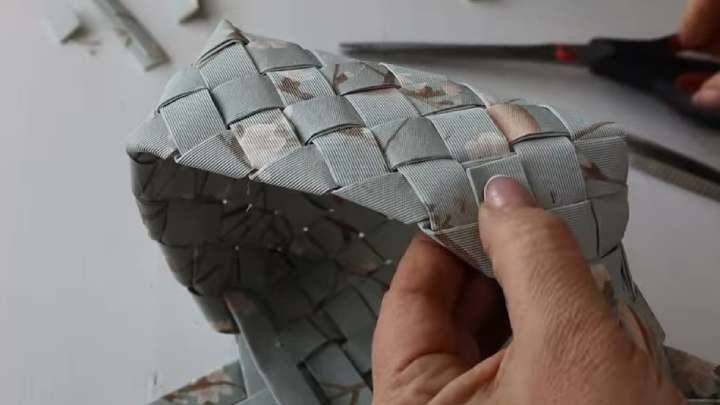 И теперь продолжите плести боковые стороны так же, как переплеталось дно. Можно, для удобства, фиксировать канцелярскими скрепками.