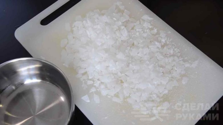 На следующем этапе нужно измельчить парафиновые свечи и растопить их на водяной бане. Жидкий парафин заливаем в формы.