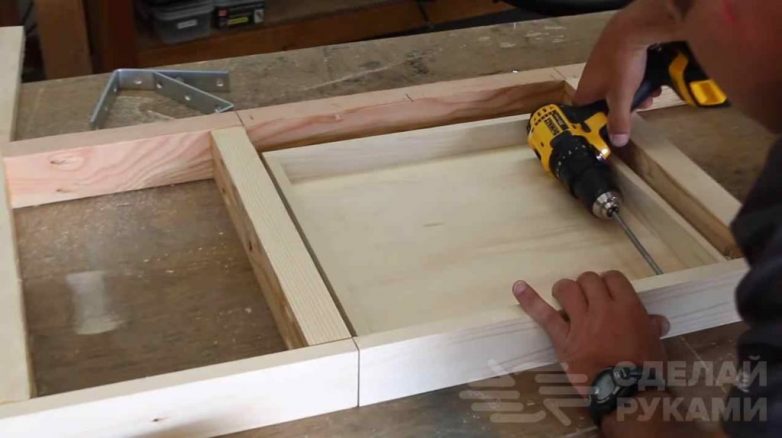 Первым делом необходимо будет отпилить по размеру деревянные бруски. Собираем из них каркас прямоугольной формы.