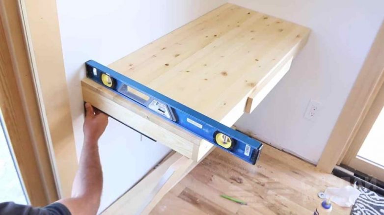 Столешницу для «плавающего» стола мастер делает из мебельного щита. Сначала крепим каркас к стене, после чего отпиливаем по размеру столешницу и крепим ее к каркасу.