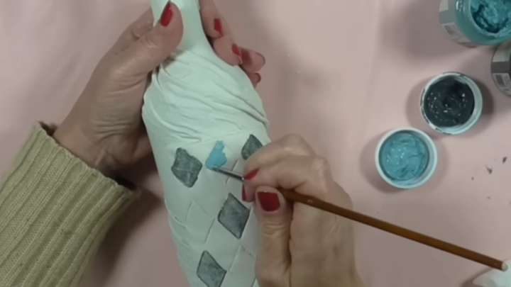 Для большей декоративности можно приклеить на клей ПВА «этикетку» из пасты для моделирования. После высыхания покройте всё белой акриловой краской с помощью губки.