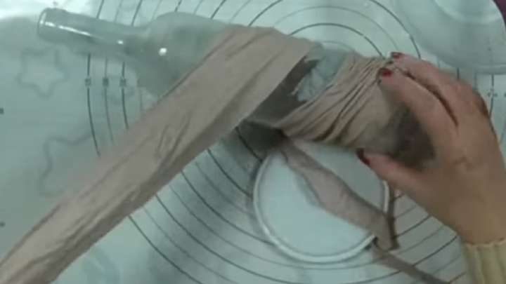Обезжирьте поверхность бутылки или банки и обмотайте колготки вокруг.