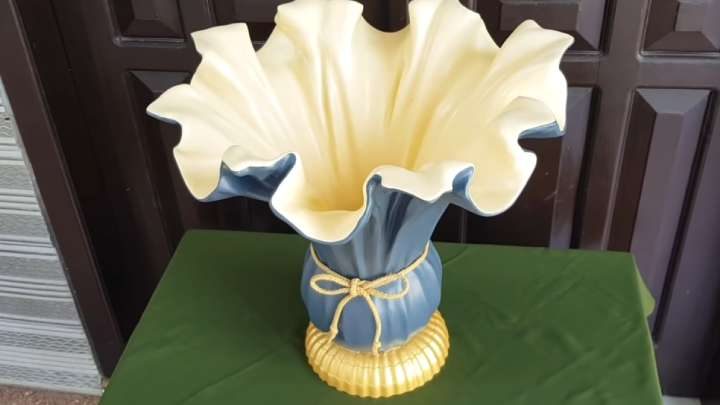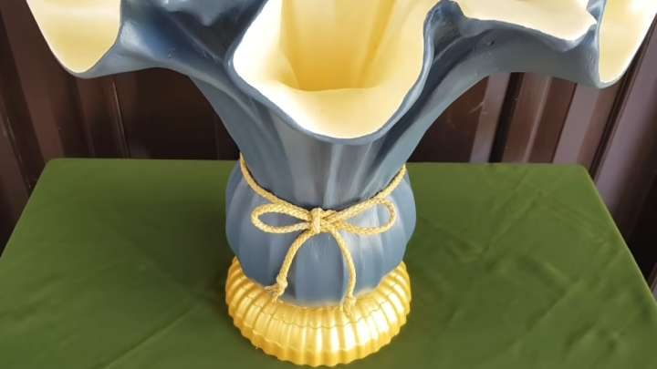 Для большей декоративности можно завязать верёвку или шнур подходящего цвета. Посмотрите, насколько шикарная ваза получилась! И практически из ничего.