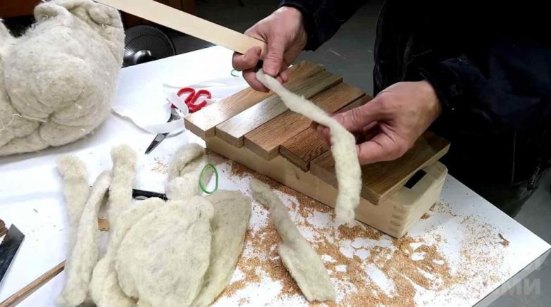 Сборка ксилофона и изготовление молоточкаДля лучшего резонанса подкладываем под каждый деревянный брусочек кусочек ваты. Размечаем места крепления (на бруске в этих местах самый глухой звук).