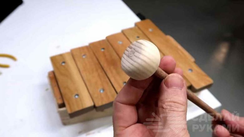 Молоточек для ксилофона тоже изготавливается из древесины, и ему нужно придать округлую форму. Закрепляется «боек» на длинной деревянной палочке.