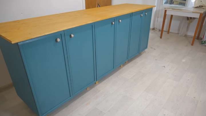 Установите ручки и столешницу. Это очень бюджетная замена магазинной мебели, к тому же, такого гарнитура не будет больше ни у кого!