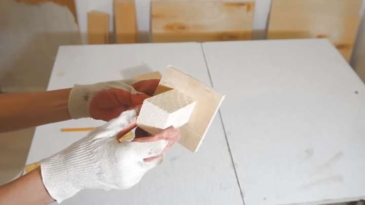 Вырежьте ножки для шкафчиков из бруска и остатков фанеры.