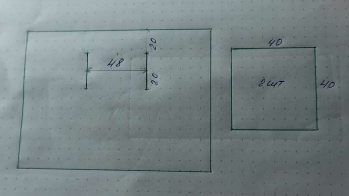 Выкройка ниже поможет вам сориентироваться. Две квадратные заготовки по 40 см. (справа на фото) вырезаются отдельно из флиса. Прямоугольник слева — это схематично нарисованный плед. На нём следует наметить и прорезать отверстия 20 см длиной, на расстоянии 20 см от длины пледа и 48 см друг от друга.