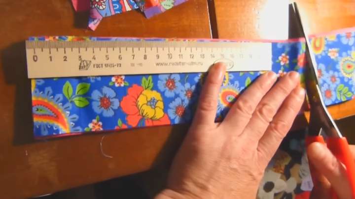 Для начала подготовьте полосы для лоскутного изделия. Одна полоса — 20*7 см, после припусков на швы она будет чуть меньше. Припуски можно делать разными — от 0,5 до 1,5 см.