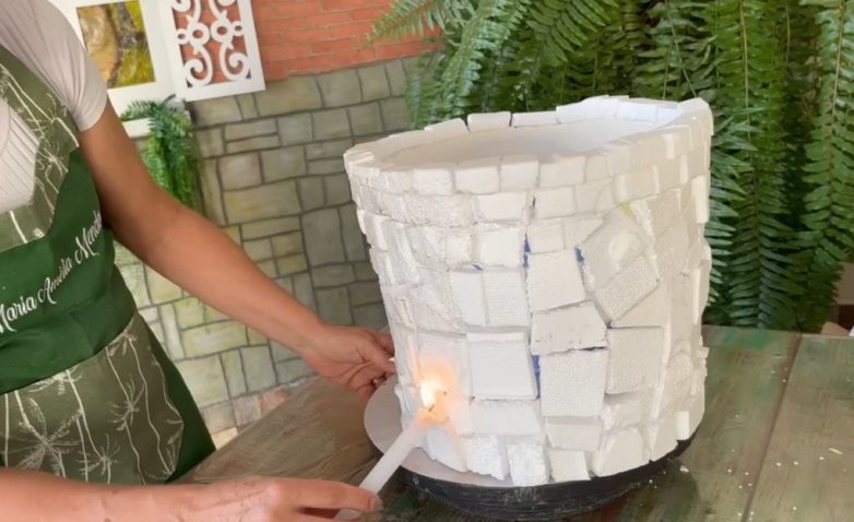 Для придания красивой текстуры «под камень» понадобится свеча, пламя которой поможет растопить поверхность пенопласта.