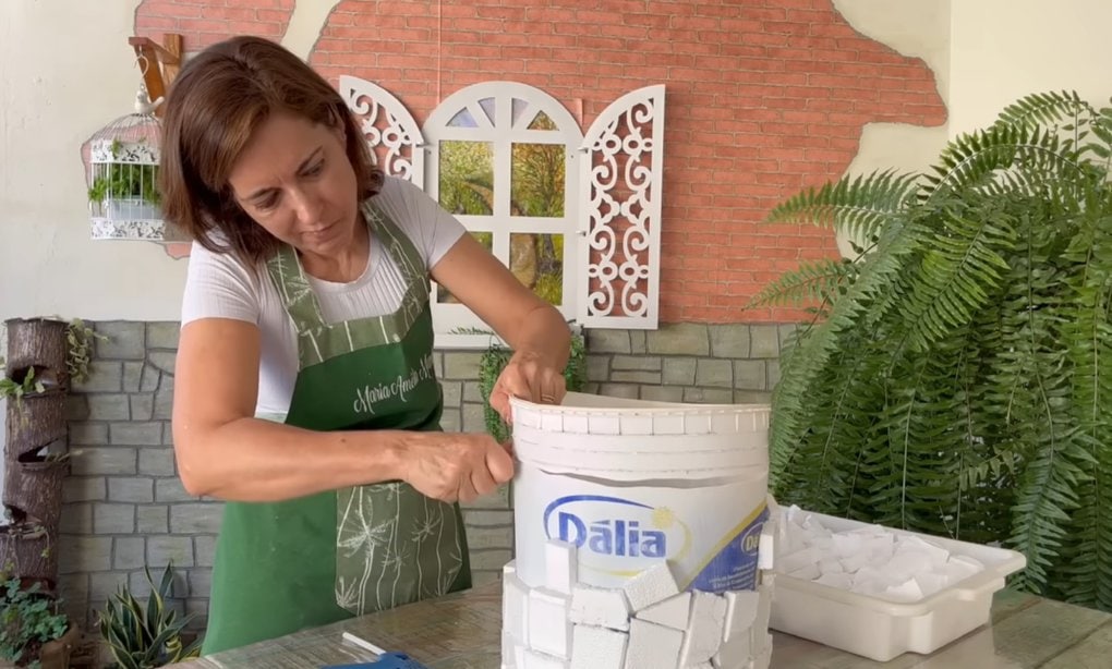 Пластиковое ведро необходимого размера тщательно промойте и зачистите его поверхность с помощью наждачной бумаги. Срежьте верхнюю часть ведра и обклейте поверхность заготовками из пенопласта.