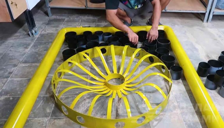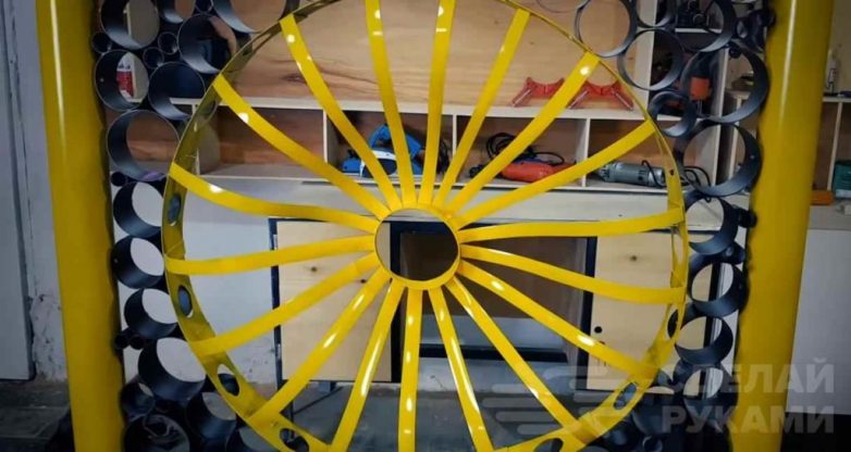 После этого отрежем пару полос из ещё одной трубы и, нагревая их, придадим им плоскую форму. Сворачиваем по форме круга и приклеиваем края лоскутов к нашему кругу.