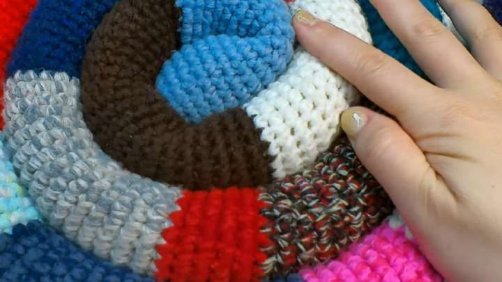 Теперь остаётся лишь свернуть её улиткой и сшить ряды между собой. У вас получился прекрасный коврик, мягкий и яркий — из остатков пряжи, которые никуда больше не годились!