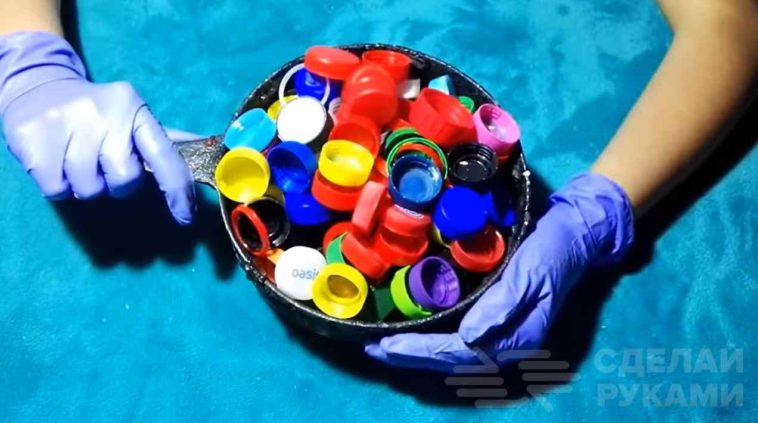 Первым делом автор берет старую металлическую кастрюлю и заполняет ее доверху крышками. Потом их нужно будет расплавить до однородной вязкой массы.