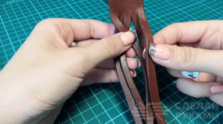 На следующем этапе обрабатываем прорезанные полоски наждачной бумагой и кремом для кожи. Заглаживаем все боковые поверхности деревянной рукояткой от шила.Плести будем как обычную косичку из пяти прядей. После первого переплетения перекидываем один край внутрь косы. Повторяем процедуру во второй раз и получаем косу без швов.